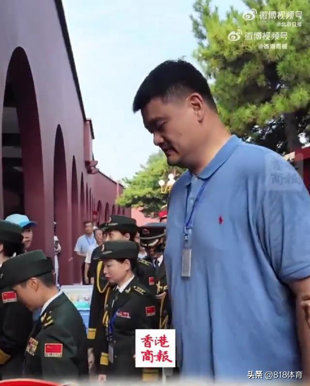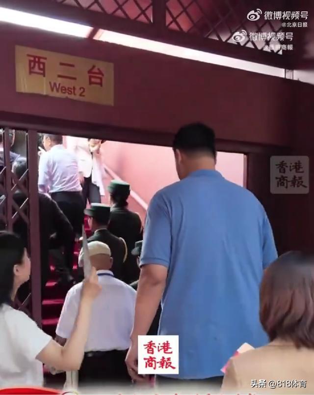 姚明以“前中国男篮运动员”身份现身天安门广场,参加纪念大会。姚明2米26的身躯,差点就撞到了门梁上。