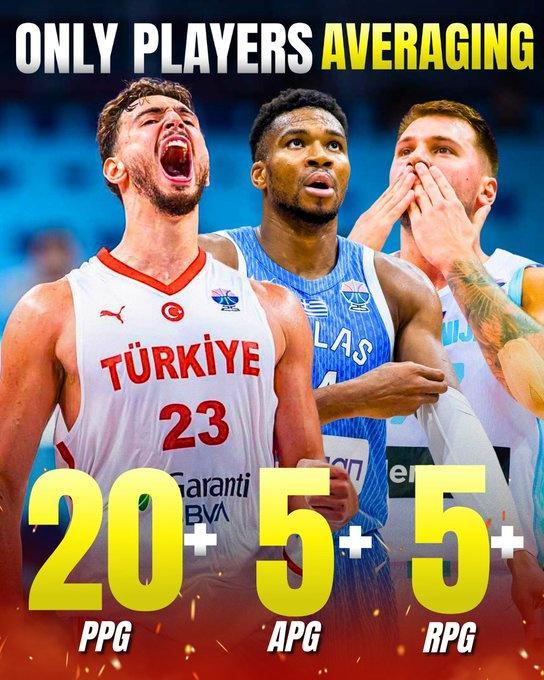 根据数据统计,本届男篮欧锦赛至今,东契奇、字母哥和申京是仅有的3位场均至少20分5篮板5助攻的球员。